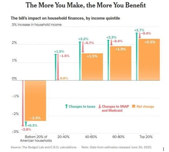 It’s been called the biggest wealth transfer – which might bring to mind money moving from the rich to the poor, but in this case, it is the poor sacrificing even more of what little they have so that the rich can have more. The New York Times had a great graphic of the bill’s effect on households (see below).